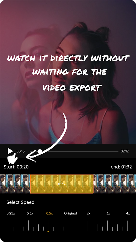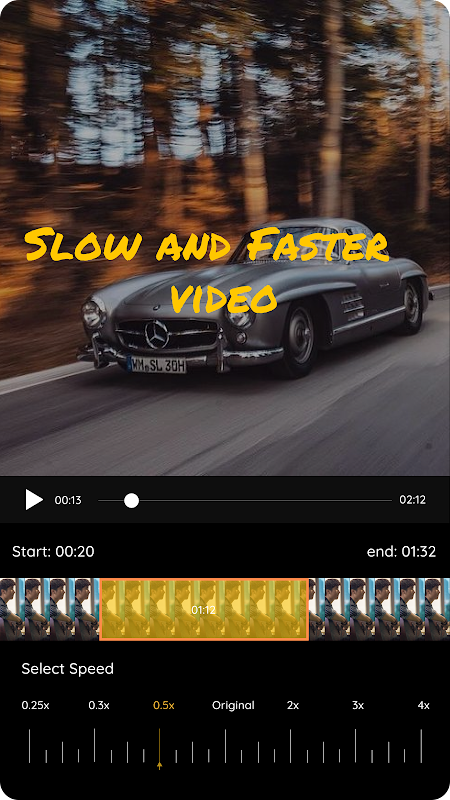✔️ أنشئ مقاطع فيديو بطيئة الحركة بسلاسة مع إعدادات السرعة التي يمكن أن تكون أبطأ أو أسرع حتى 4 مرات من الفيديو الأصلي