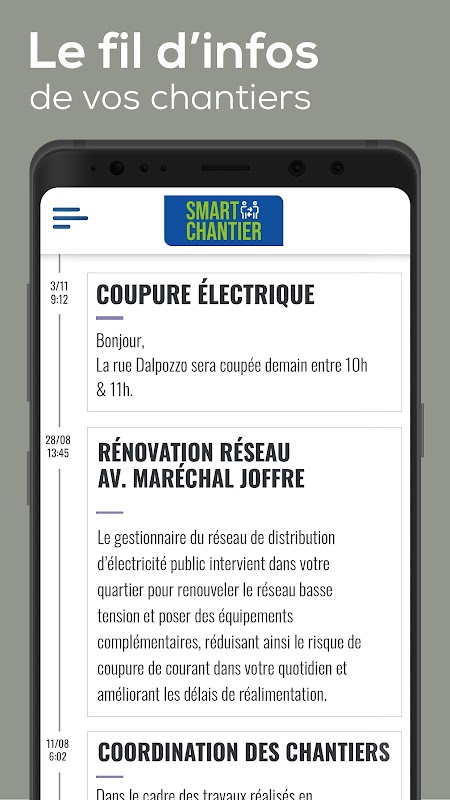 يوفر تطبيق Smart Chantier الوصول إلى معلومات في الوقت الفعلي عن الجينات التي يسببها العمل الحالي أو المستقبلي.