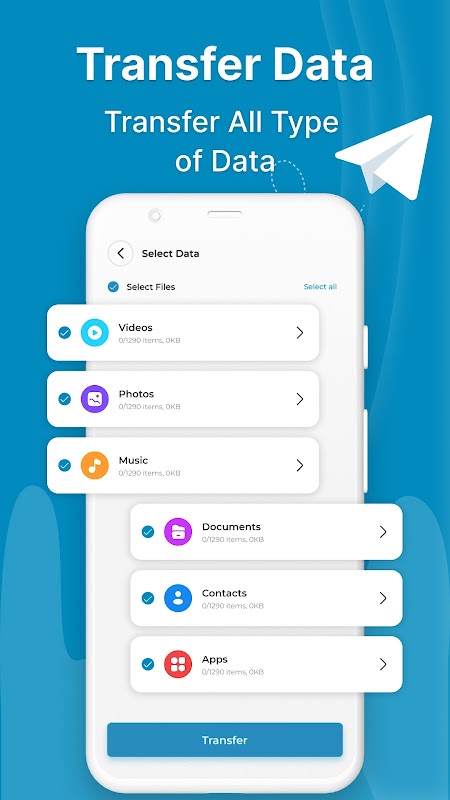 يمكنك هنا نقل بياناتي ونسخ بياناتي وجهات الاتصال الخاصة بي بسهولة! النقل الذكي عبر الهاتف المحمول بين الأجهزة باستخدام نسخ بياناتي البسيطة. تطبيق الهاتف المستنسخ سريع. لا تحتاج إلى الانتظار لفترة طويلة حتى يتم النقل. يمكنك الجلوس والاسترخاء أثناء تبديل الهواتف لنقل البيانات. تخلص من عملية نقل بيانات الهاتف المحمول القديمة الطويلة وقم بإجراء نقل بسيط باستخدام تطبيق النقل الذكي للهاتف المحمول. حدد الملفات التي تريد مشاركتها وقم بنقل جميع البيانات بسهولة أثناء التنقل!