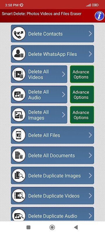 سمارت حذف التطبيق المجاني الروبوت هو قوي ولكن سريعة وسهلة صور ملفات الفيديو ملفات ممحاة ومزيل مكررة. الآن لا تحتاج إلى إضاعة وقتك وجهودك في حذف الملفات غير الضرورية من هاتفك المحمول باستخدام خيارات الحذف الأساسية الخاصة بهاتفك الخلوي.