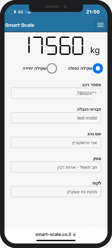 ניתן לצפות גם ממכשיר סלולרי בחיבור לאינטרנט, שידור משקל המשאית בזמן אמת.