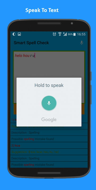 Advanced Spell Check for your android. This spell checker apps provide the facility to check correct and incorrect word with speech to text and text to speeh.