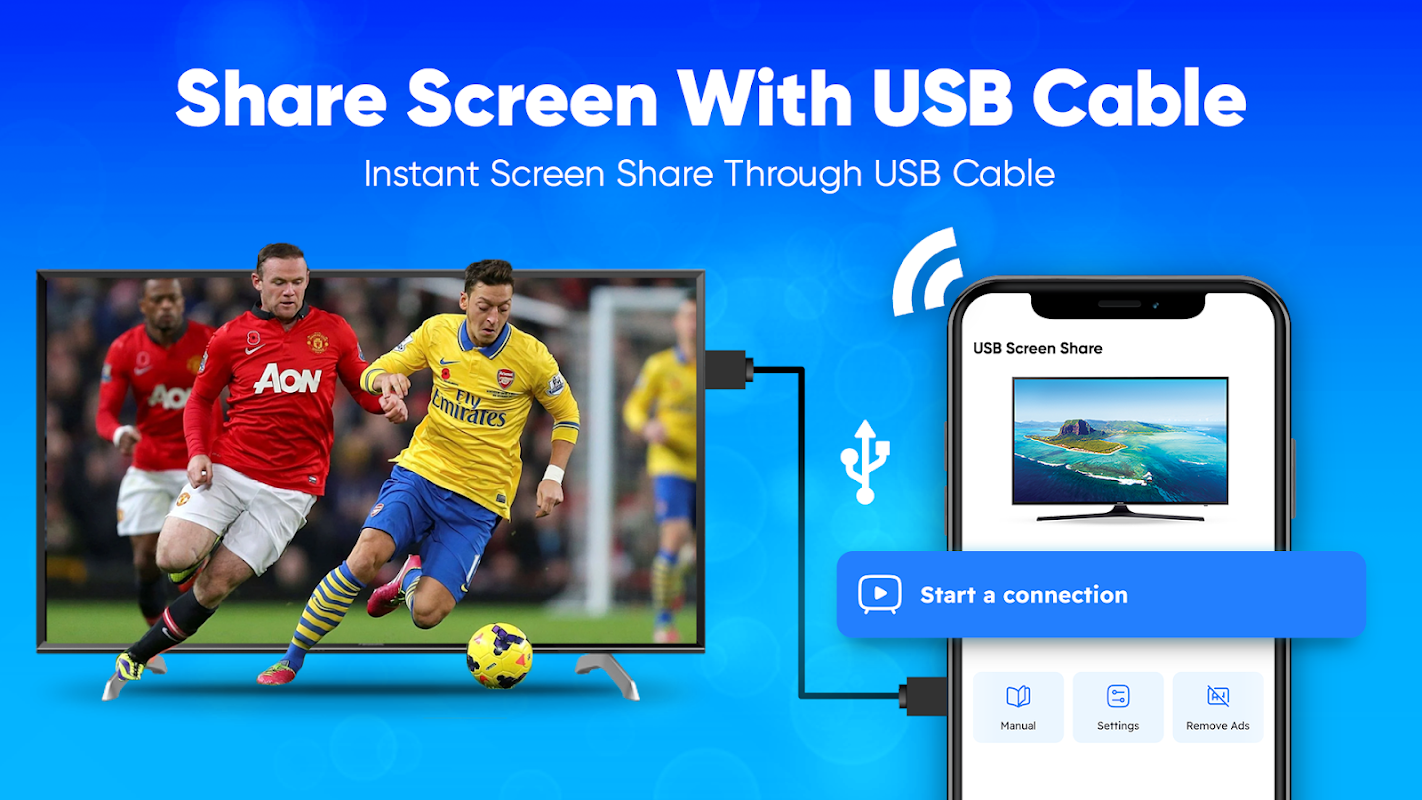 قم بتحويل تجربة مشاركة الشاشة الخاصة بك من خلال اتصال سريع وسهل وموثوق بين هاتفك المحمول والتلفزيون باستخدام USB Screen Share.