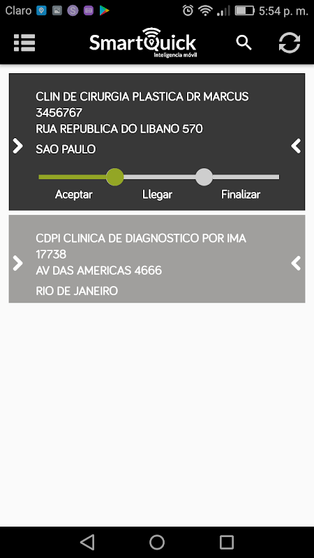 Aplicación que permite recibir la agenda de visitas de un colaborador desde la plataforma web de SmartControl y darle el curso correcto a cada visita pasando por sus distintos estados para culminar en la toma de muestras digitales. Los estados por los cuales atraviesa la tarea dan como resultado el seguimiento y supervision de los tiempos de alistamiento, distribución y entrega.
