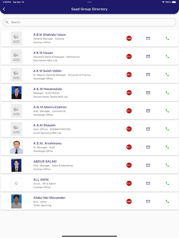 دليل الشركة: قم بالوصول إلى معلومات الاتصال الخاصة بزملائك في لمح البصر. ابق على اتصال عبر المكالمات الهاتفية أو رسائل البريد الإلكتروني أو الرسائل النصية القصيرة أو WhatsApp مباشرة من التطبيق، مما يسهل التواصل السلس ويعزز التعاون.
