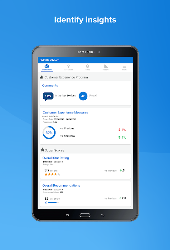 بالنسبة لعملاء SMG الذين لديهم اسم مستخدم وكلمة مرور صالحين ، يوفر تطبيق الإبلاغ عن smg360 وصولًا ديناميكيًا في الوقت الفعلي إلى تعليقات العملاء ومصادر البيانات الأخرى بغرض اتخاذ إجراء سريع بشأن الرؤى التي تعمل على تحسين تجارب العلامة التجارية وزيادة ولاء العملاء. تطبيق التقارير smg360 متاح بأكثر من 40 لغة.