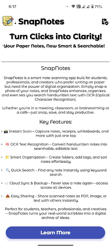 SnapNotes هو تطبيق ذكي لمسح الملاحظات، مصمم للطلاب والمحترفين والمبدعين الذين يفضلون الكتابة على الورق ولكنهم يحتاجون إلى قوة التنظيم الرقمي. ما عليك سوى التقاط صورة لملاحظاتك، وسيُحسّن SnapNotes النصوص المكتوبة بخط اليد ويُنظّمها، بل ويتيح لك البحث عنها باستخدام تقنية التعرف الضوئي على الحروف (OCR).