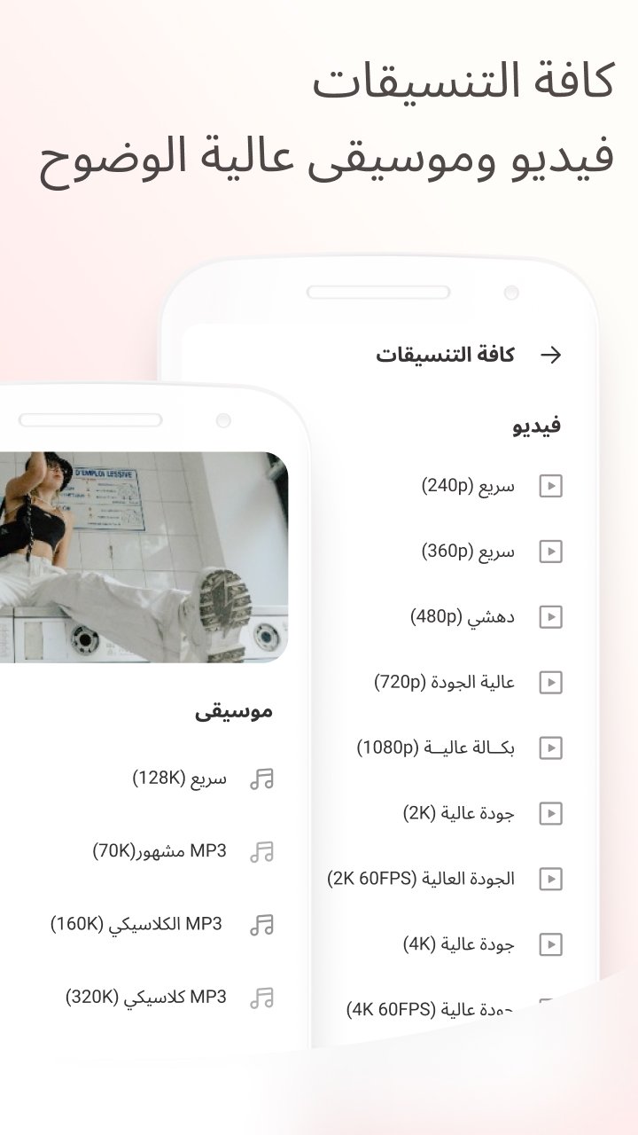 يمكنك اختيار دقة مختلفة لمقاطع الفيديو التي قمت بتنزيلها بتنسيقات 144p و720p و1080p HD و2k HD و4K HD والصوت بتنسيق MP3 أو M4A. يمكنك اختيار دقة أقل لمساعدتك في توفير مساحة التخزين على هاتفك.