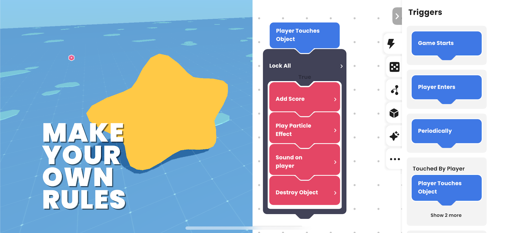 - محرر السلوك: اجعل لعبتك تنبض بالحياة من خلال محرر السلوك سهل الاستخدام. قم بتوصيل الكتل الشبيهة بالألغاز لإضافة تفاعلات منطقية وممتعة.