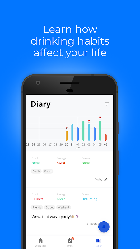 - فرز الأشياء بالكحول. سيساعدك Sober One على فهم سبب الشرب وماذا تشربه بشكل أفضل.