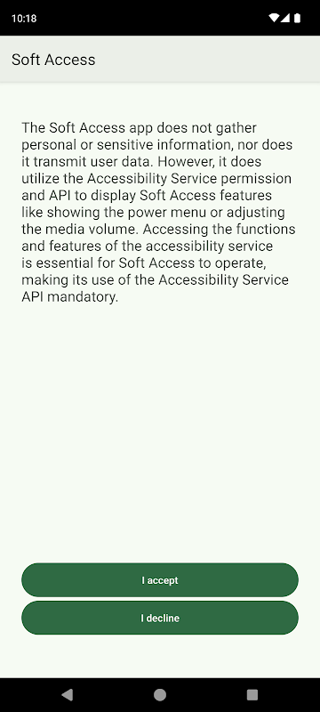 يعتمد تطبيق Soft Access على Accessibility API لتزويد المستخدمين بالميزات والوظائف الأساسية. من خلال الاستفادة من خدمة إمكانية الوصول، يمكن لـ Soft Access عرض خيارات قائمة الطاقة على الشاشة بسلاسة، وضبط مستوى صوت الوسائط لضمان سهولة الوصول وسهولة الاستخدام لجميع المستخدمين.