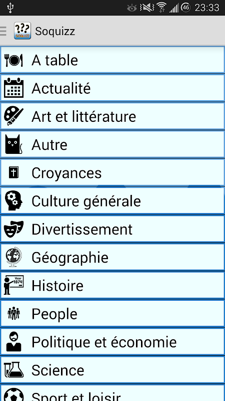 Découvrez des milliers de questions, créez vos propres question ! Choisissez un thème général ou très précis parmi des dizaine de thèmes (sciences, cinéma, jeux vidéo (actuel, rétro, mobile), histoire, géographie, football, sport, formule 1, etc ...), un thème n'existe pas ? Créez le !