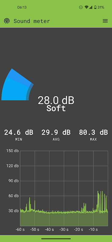 مقياس الصوت هو مقياس مستوى صوت بسيط وسهل الاستخدام (أو SPL) لجهاز Android الخاص بك. في واجهة سهلة الاستخدام ، تعرض مستويات الضوضاء الحالية من حولك. قيم الحد الأدنى / المتوسط / الأقصى للديسيبل ، وتحذيرات لمستويات الضوضاء العالية. كما أنه يتميز بالرسم البياني بقيم مُقاسة للدقيقة الأخيرة. يعد مقياس الصوت من الأدوات الأساسية لأولئك الذين لديهم فضول بشأن مستويات الصوت من حولهم.