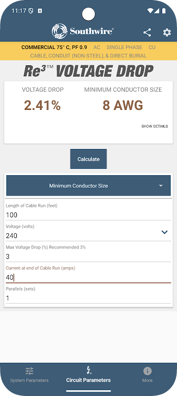Southwire الجهد قطرة يحدد حجم السلك المناسب للدارة الكهربائية.