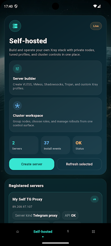 يدعم Space VPN تقنيات اتصال متعددة، بما في ذلك خيارات مثل OpenVPN وWireGuard وShadowsocks وV2Ray وXray وVLESS وVMess، وذلك بحسب الإعدادات المتاحة في التطبيق.