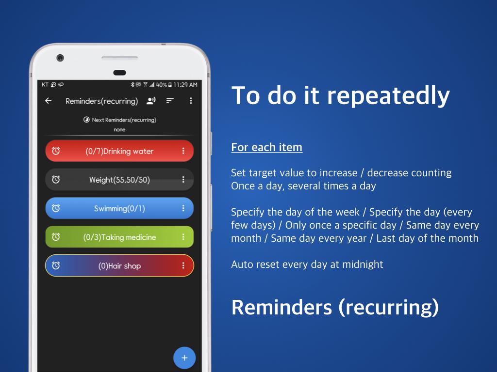 - الشرب ، مياه الشرب ، وما إلى ذلك عن طريق النص / الجرس / الاهتزاز ، وما إلى ذلك ، سيتم إخطارك بانتظام مع الكلمات / الجرس / الاهتزاز / ملء الشاشة.