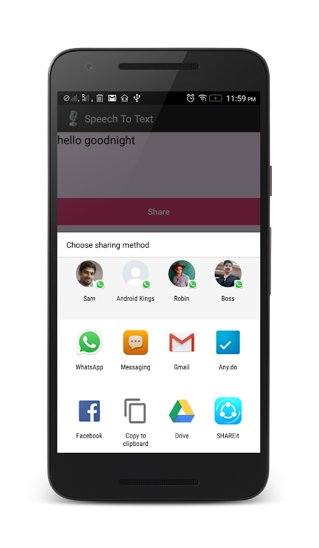 This speech to text enables you to converts your spoken words to text and copy/share to any other android App like Whatsapp,Facebook Messenger, gmail etc....
