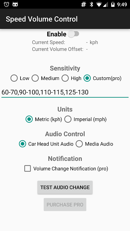 - Test button, to validate the volume change works on your device without needing to drive around.