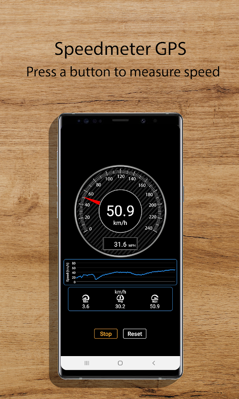 يقيس عداد السرعة إزاحة السرعة للمستخدم باستخدام نظام تحديد المواقع العالمي للهاتف الذكي. يتطلب عداد السرعة GPS مساحة خالية للاتصال الكافي بالأقمار الصناعية التي توفر نظام تحديد المواقع العالمي (GPS). يتم عرض البيانات على شاشة الجهاز بشكل تناظري ورقمي. يعرض التطبيق السرعة القصوى والمتوسط والدنيا بالكيلومتر / الساعة. بالإضافة إلى ذلك ، يتم عرض رسم بياني لسرعة المستخدم. يمكن تكوين عداد السرعة GPS لإصدار إنذار عند تجاوز السرعة التي حددها المستخدم. يتم عرض وحدة السرعة بالكيلومتر / الساعة و MPH.