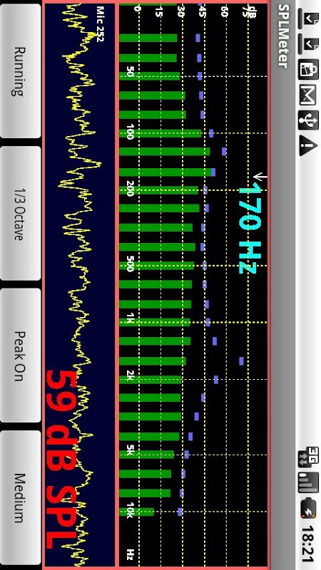 SPLMeter يظهر SPL (ديسيبل) من إشارات هيئة التصنيع العسكري والروبوت، وطيف الترددات الخاصة بهم. المقياس لديه ثلاث سرعات: سريع، متوسطة وبطيئة. يظهر الذروة المغلف وتردد من أقصى كثافة، وقطة. ISO 1/3 أوكتاف والحانات والطيفية.