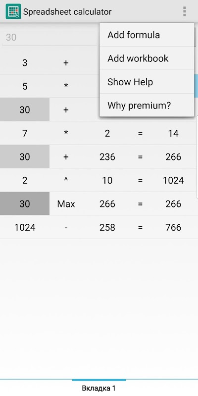 في جدول التطبيق حاسبة كل صف هو صيغة واحدة مع اثنين من المعاملات والنتيجة. كل المعامل يمكنك تحديد أو إنشاء رابط يؤدي إلى الصيغة السابقة (على سبيل المثال). وعندما نتيجة للصيغة السابقة تغيرت - سيتم تغيير المعامل ترتبط تلقائيا. هذا هو بسيط جدا! جربها!