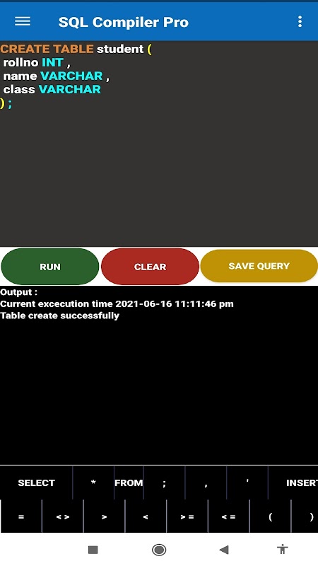 This apps can compile any basic SQL query and student can practice SQL languages on android mobile phones by writing and compiling query on this apps.