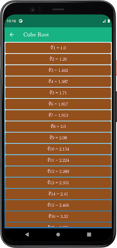 يوفر هذا التطبيق سكوير، الجذر التربيعي، مكعب، مكعب الجذر ومضروب عدد 1-1000.