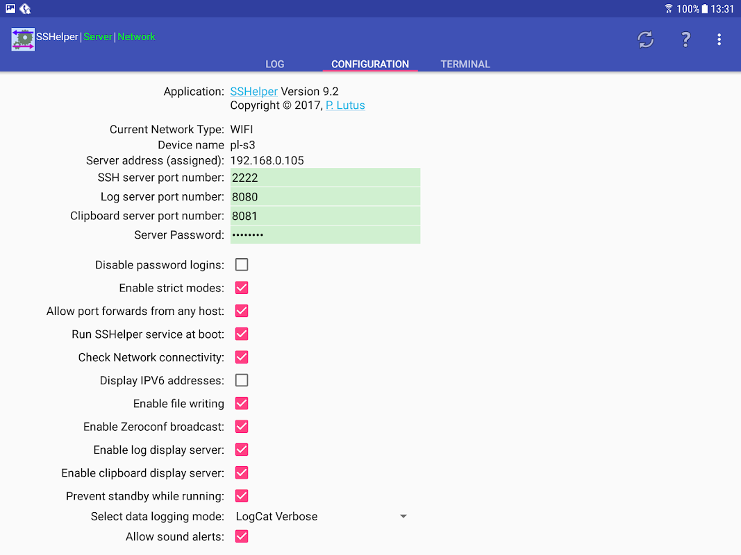 يقع SSHelper الصفحة الرئيسية في http://arachnoid.com/android/SSHelper - زيارة لمزيد من المعلومات والتكوين النصائح.