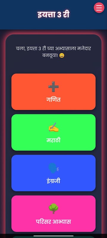 "المستوى الثالث" تطبيق مصمم خصيصًا لطلاب الصف الثالث. صُمم هذا التطبيق لتعليم اللغة الماراثية والرياضيات واللغة الإنجليزية ودراسات المناطق بطريقة معمقة وسهلة. يتضمن نصوصًا مفيدة وتمارين وأنشطة عملية وإرشادات صوتية تُمكّن الأطفال من الدراسة الذاتية.
