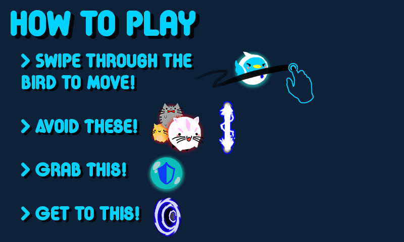 Swipe to move. The faster you swipe the faster you fly! Swipe and bounce your way to the portal at the end of the level without getting hit!