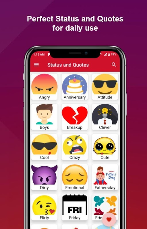 قم بتنزيل تطبيق Status and Quotes الخالي من الإعلانات الآن ورفع مستوى لعبتك على وسائل التواصل الاجتماعي. احصل على الإلهام والتحفيز وشارك أفكارك مع العالم! "