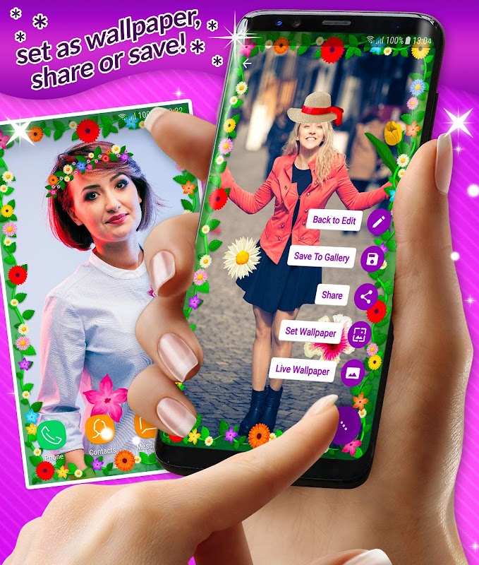 Make your phone screen sparkle and shine with a variety of beautiful spring and summer flowers that you can place on you selfie or image, wherever you like!