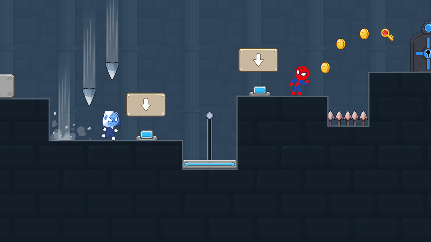👉 تحرك الصبي الأحمر والفتاة الزرقاء بالسهام وتجنب العقبات. يجب على الصبي الأحمر تجنب الماء بينما يجب على الفتاة الزرقاء تجنب الحريق.