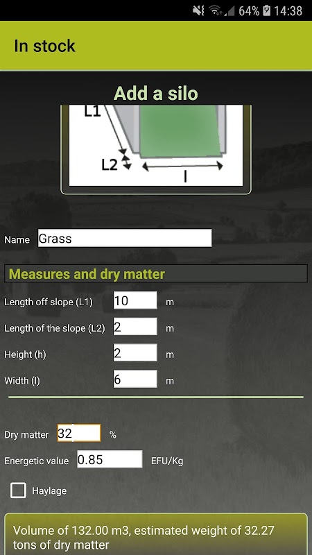 بالنسبة إلى علف البالات ، من خلال تحديد القطر ، يمكن للتطبيق تحديد وزن DM لبالة ، فيما يتعلق بالسيلاج الذي يبسط حساب وزن صومعة (تخزين أو مستودع): فقط أدخل أبعاد صومعة ونسبة المادة الجافة للحصول على حمولة DM.