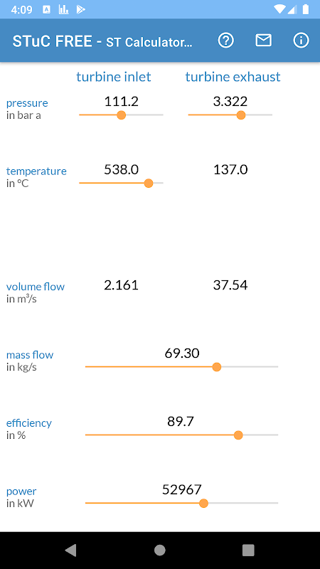 يمكنك بسهولة تعديل شروط الحدود من خلال أشرطة تمرير التطبيق. لكل حساب ضغط المدخل، تكون درجة حرارة المدخل وضغط العادم إلزامية. يمكن حساب قوة التوربينات والتدفقات الحجمية ودرجة حرارة العادم.