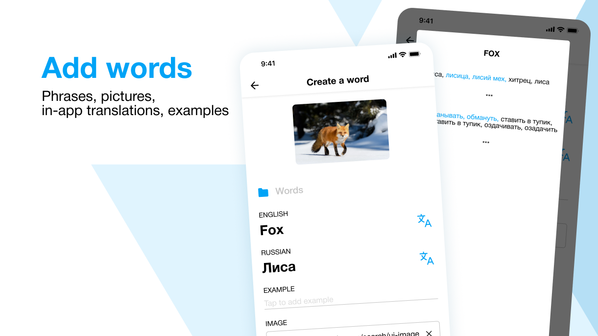 قم بتطوير قاموسك الشخصي كاملاً بالترجمات والأمثلة التوضيحية والصور الترابطية. تتوفر أربع ألعاب متميزة لمساعدتك على دراسة مفرداتك. يشتمل التطبيق أيضًا على ميزة الترجمة ، التي تدعمها واجهة برمجة تطبيقات قاموس Yandex وواجهة برمجة تطبيقات قواميس أكسفورد. في الوقت الحالي ، يلبي تطبيقنا 17 لغة.