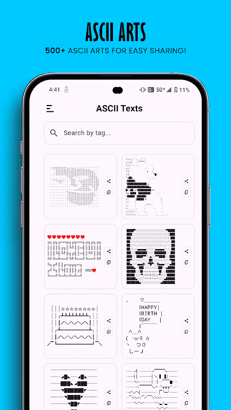• أكثر من 500 تصميم فني لـ ASCII: يمكنك مشاركة فن ASCII الإبداعي بسهولة بنقرة واحدة فقط.