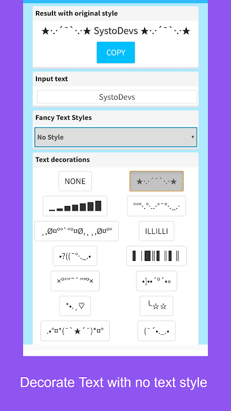 لإضفاء نمط على نصك ، ما عليك سوى كتابة رسالتك في حقل النص الأول. سيتم تحويل النص الخاص بك إلى أنماط نصوص خيالية مختلفة في الحقول أدناه. ما عليك سوى النقر فوق الزر "نسخ" للنص الذي تريده وسيتم نسخه بحيث يمكنك استخدامه عن طريق لصقه في أي مكان تريده.