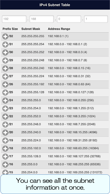 من خلال إعطاء عنوان IP فقط، يمكنك معرفة معلومات مثل عنوان النطاق، عنوان البث، عدد الجنود الخ في الشبكة الفرعية قناع (/ 32 ~ / 1).