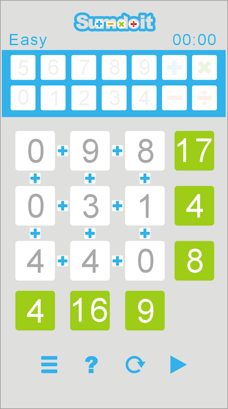 Sumdoit is great fun for children, math wizards and everyone in between. It only uses single digits from 0 to 9 and no equation is greater than 20. Sumdoit uses simple math to improve your speed, problem solving and focus skills. It has 3 main levels, 2 x 2, 3 x 3 and 4 x 4 grids with 4 levels for each, Easy, Difficult, Extreme and Insane. Your children will love the 2 x 2 and you the 3 x3 and for those of you who excel in math the 4 x 4 will give you the challenge you are looking for.