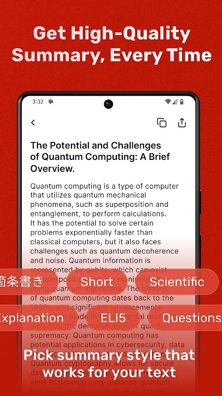 وتخيل ماذا؟ التطبيق غير مقيد باللغة. اختر من بين لغات متعددة لتلخيص النص الخاص بك. يتيح لك التطبيق أيضًا اختيار نمط التلخيص الخاص بك. نقاط مقسمة؟ يفحص. حوار سهل الهضم؟ نعم، لقد حصلنا على ذلك أيضا. فقرات بسيطة ومباشرة؟ بالطبع. قم بتخصيص ملخصك بالطريقة التي تريدها.