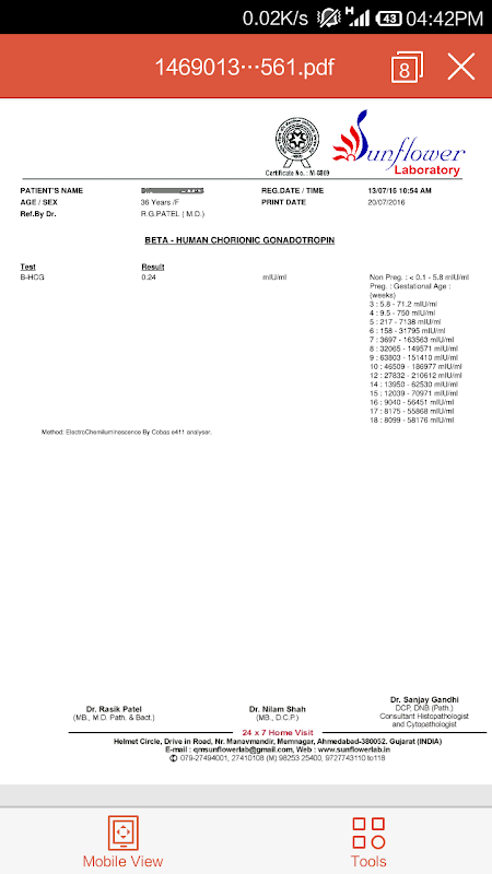 Sunflower laboratory is advanced and fully automated technology in hematology, biochemistry, clinical pathology, histopathology, liquid based cytology in PAP smear. It is situated on helmet cross roads of Ahmedabad. It provides Personal Health record (eHealth wallet) Mobile application (“sunflower lab”) to its customers to view the results and download/print the complete report anytime, anywhere for lifetime.