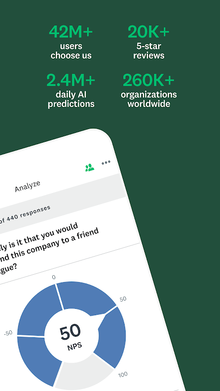 مع تطبيق SurveyMonkey، يمكنك بسهولة إنشاء الاستبيانات والنماذج وإرسالها وتحليلها - في أي وقت ومن أي مكان. سواء كنت تجمع ملاحظات العملاء، أو تتحقق من نبض الموظفين، أو تُجري أبحاثًا سريعة في السوق، يُسهّل تطبيقنا للجوال البقاء على اطلاع دائم بالبيانات التي تُوجّه قراراتك.