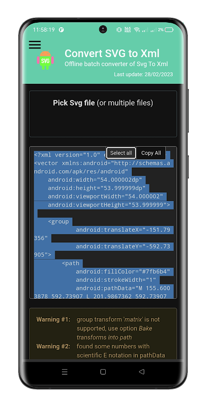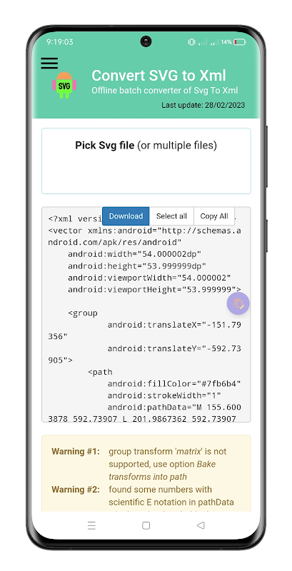 أداة سهلة الاستخدام وفعّالة تُمكّنك من تحويل صور SVG إلى صيغة XML لنظام Android. هذا التطبيق مثالي للمطورين والمصممين الذين يرغبون في استخدام صور SVG في مشاريع Android الخاصة بهم.