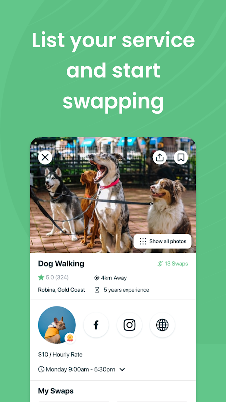 ابحث عن منتجاتك أو خدماتك وتبادلها في جميع أنحاء أستراليا. اعثر على كل شيء من البستنة إلى صيانة المنزل، ومن البناء إلى اللياقة البدنية، ومن الأثاث إلى العناية الشخصية مباشرةً على التطبيق. إذا كان لديك منتج أو خدمة، فأدرجها وابدأ التبادل على تطبيقنا اليوم.