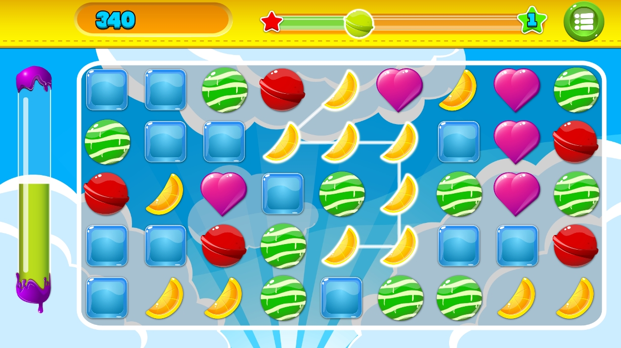 It is with classical game. The rules are very simple: you can only destroy 3 or more items. Destroy can on horizontals, verticals and even at an angle. If you are destroying more than 3 elements, then for each element is given an extra second.