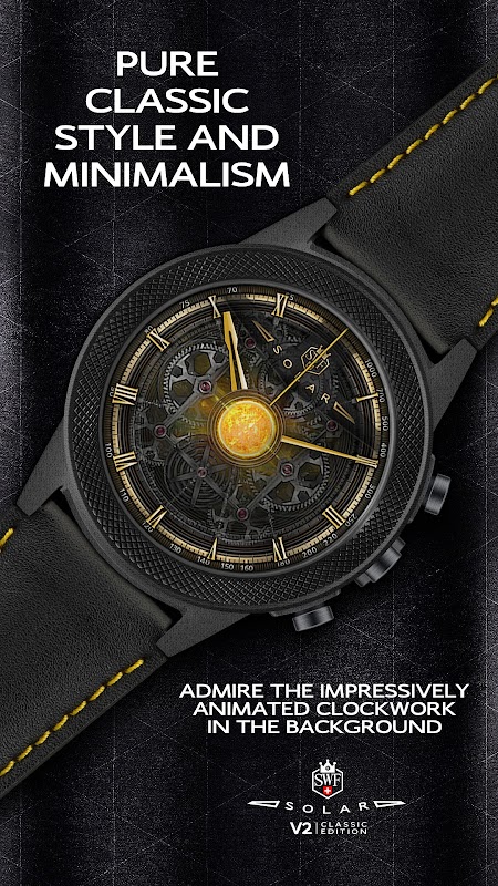 وجه الساعة التناظرية SWF Solar V2 Classic يثير الإعجاب بساعة متحركة مفصلة وتتيح لك إنشاء آلاف المجموعات المختلفة عن طريق الجمع بحرية بين الحدود والإطار والزجاج والخطوط والأرقام والعقارب والألوان. تتيح لك سلسلة PRO تكوين ما يصل إلى 8 تطبيقات مخصصة على وجه الساعة التناظري.