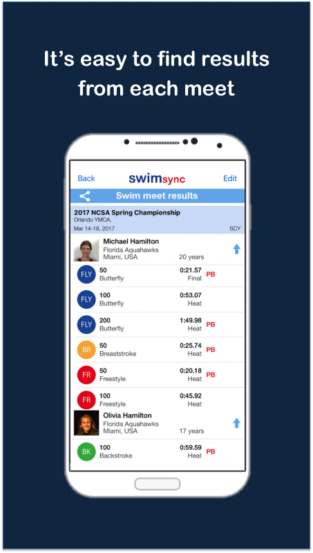 Swimsync هو تطبيق سباحة ممتاز لتنظيم وتتبع أوقات السباحة الخاصة بالسباحين. تم تصميم التطبيق لجميع سباحي حمامات السباحة والمياه المفتوحة. يجعل Swimsync من السهل رؤية كل PBs للسباحين ، وتحقيق النتائج وتحديد أوقات الأهداف. يتم تنظيم نتائج السباحة في اجتماعات ، وضربات ، ومسافات. يمكنك مشاهدة أفضل الأوقات للسباح في شاشة واحدة. يمكن أيضًا حفظ أوقات السباحة للياردات والأمتار. سهل الاستخدام وأفضل تطبيق سباحة لتنظيم أوقات السباحة.