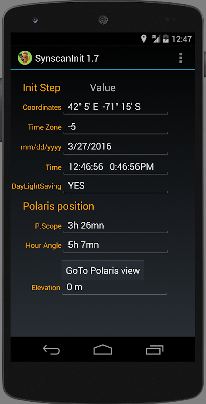 Cette application simple vous permettra d'initialiser rapidement votre synscan pour la mise en station de votre télescope. Il calcule aussi l'angle polaire avec deux reticules differents.