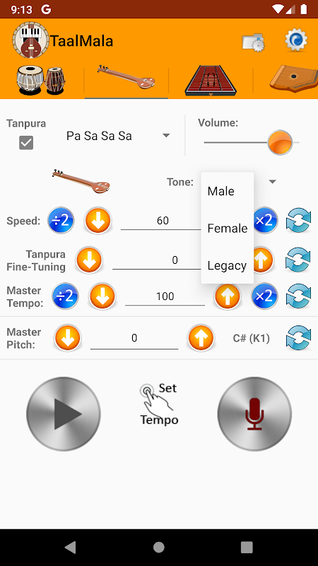 - أصوات Tanpura عالية الجودة مع تضمين جميع أنماط Tanpura الشهيرة